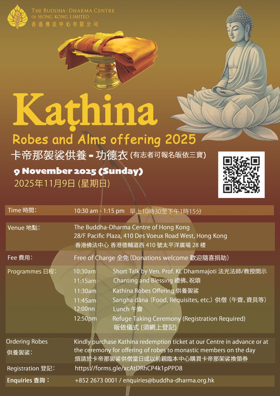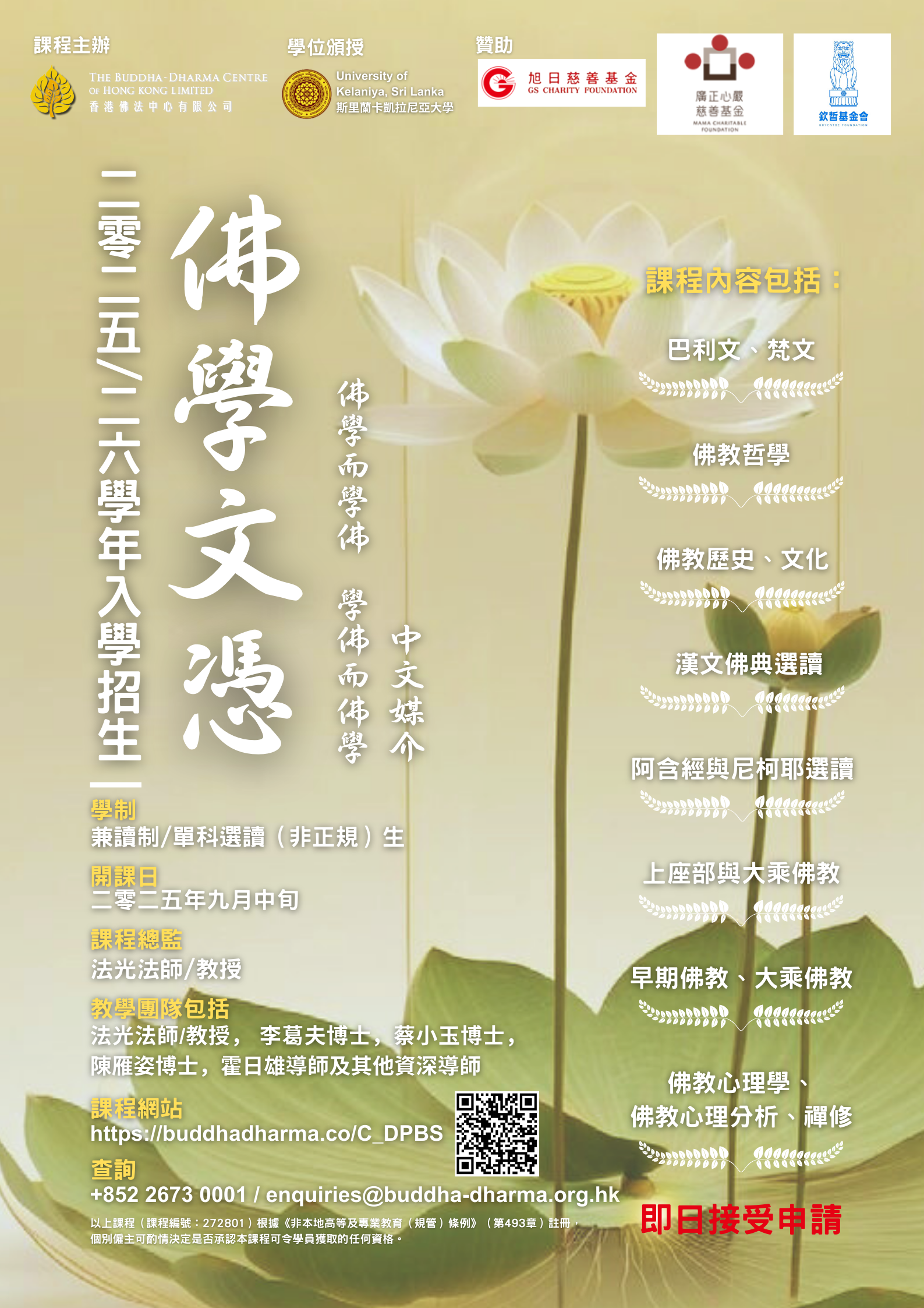 Please apply and to enquire at: +852 2673 0001 / enquiries@buddha-dharma.org.hk