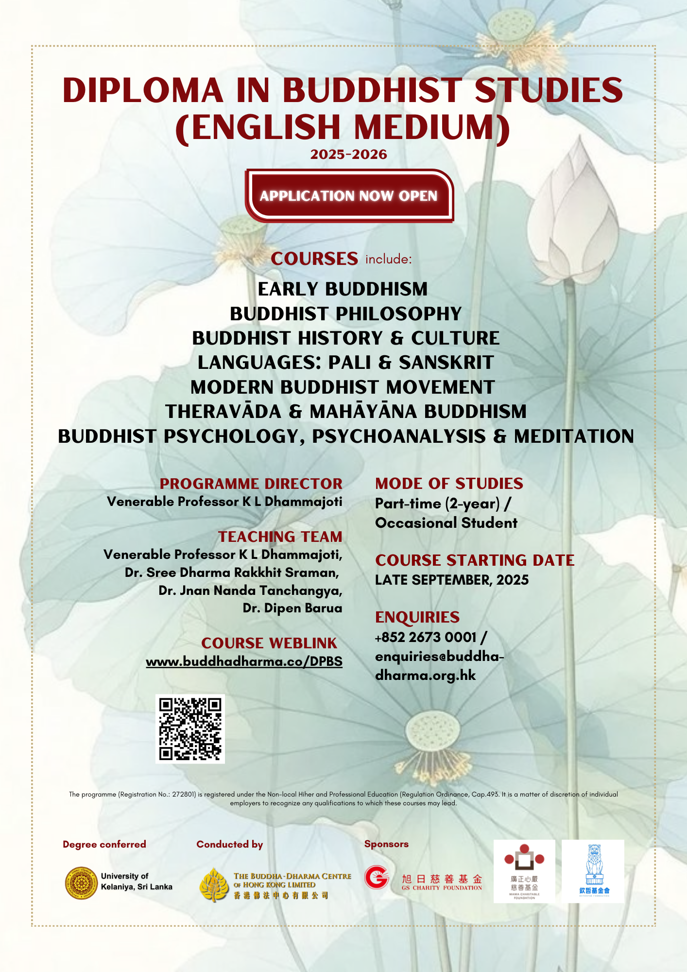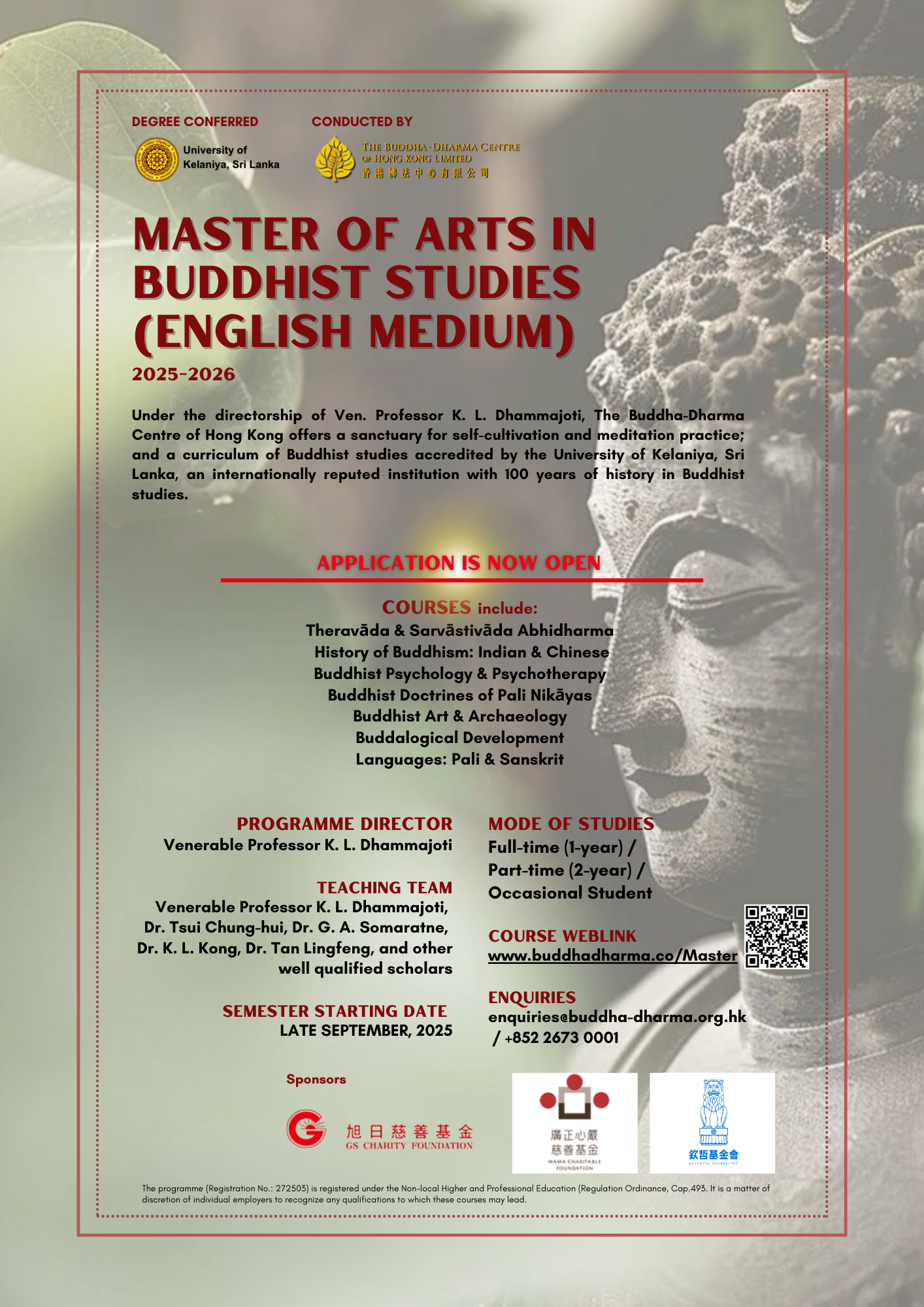 The Buddha-Dharma Centre of Hong Kong (BDCHK) is inviting applications for the Master of Arts in Buddhist Studies and Diploma in Buddhist Studies (English Medium) programmes for the new semester. Applicants who are interested in taking only certain courses may enrol as Occasional Students (OS).