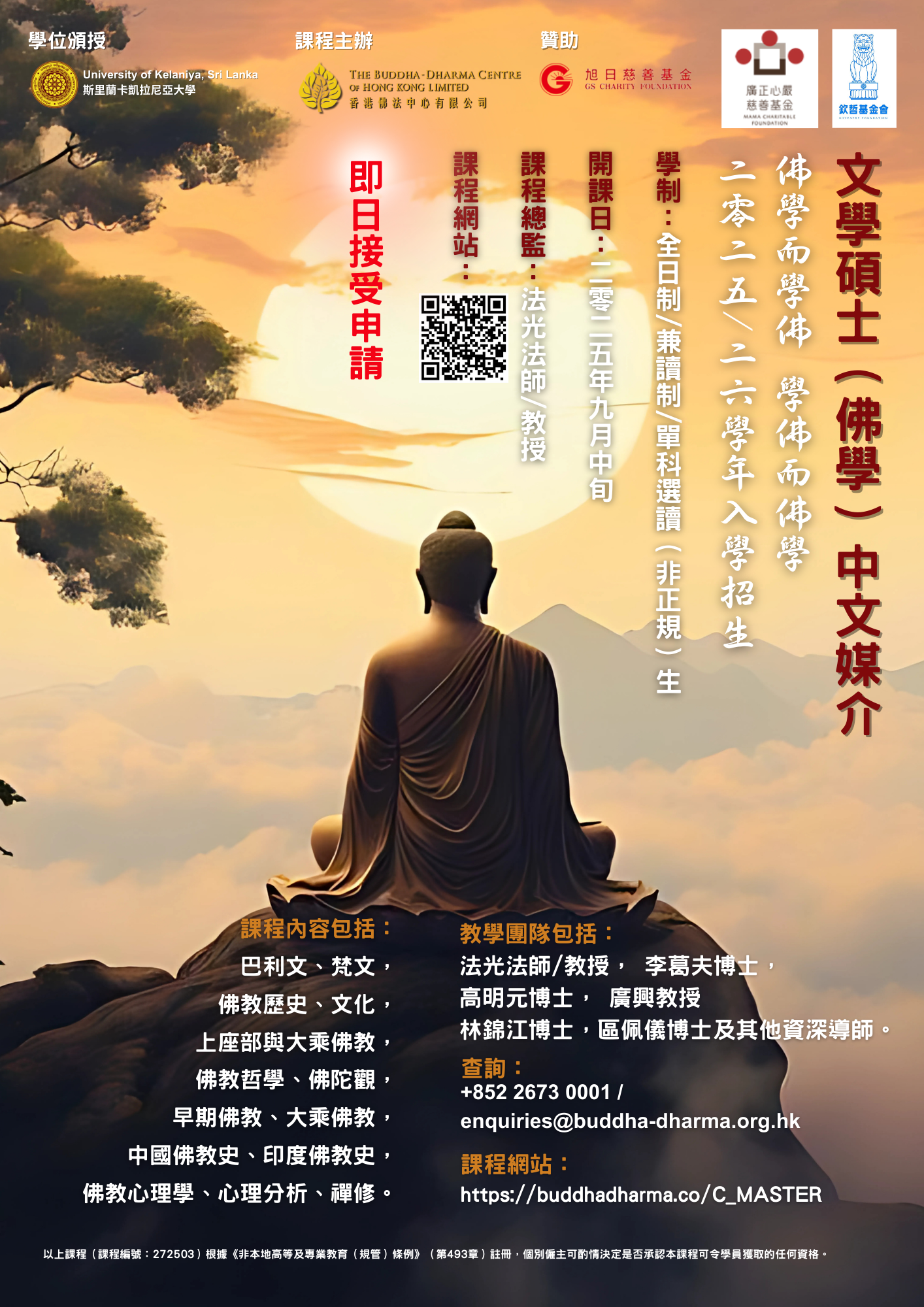 香港佛法中心 文學碩士及佛學文憑(中文媒介) 新學期現正招生