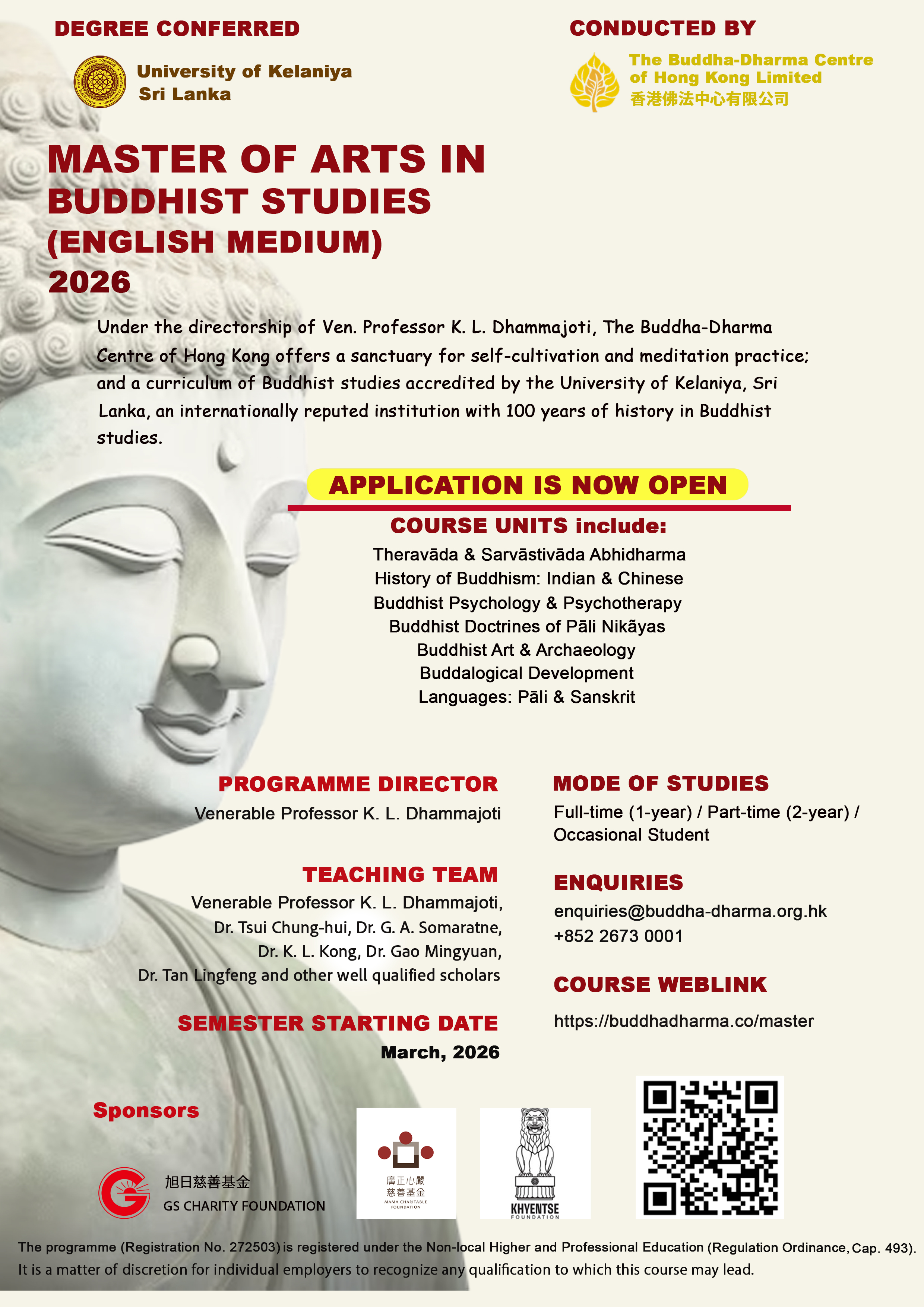 Please download the application form, and submit a completed copy, along with certified copies of your academic credentials, three recent photographs (45mm X 35mm) of yourself and an application fee of HK$500 (cheque payable to The Buddha‑Dharma Centre of Hong Kong Ltd.) to BDCHK. Payment by telegraphic transfer can be effected in accordance with the following instructions: